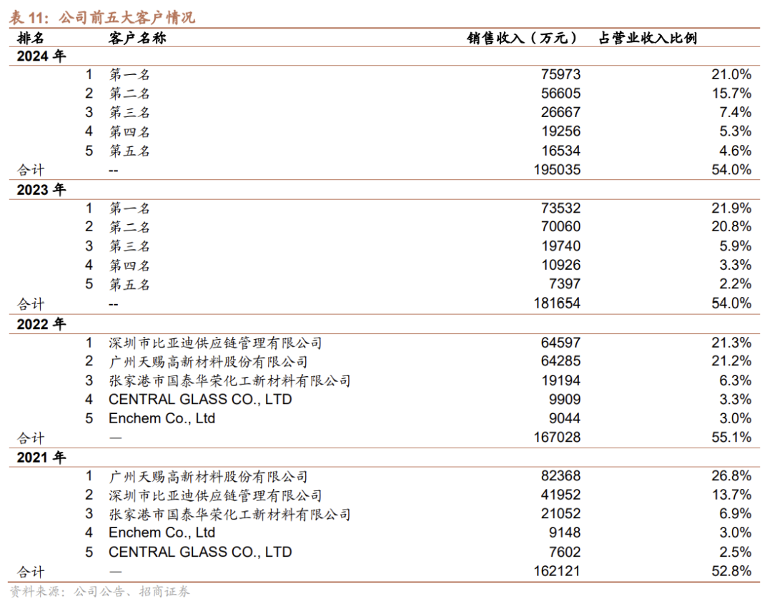 2024年,公司前五大客户合计销售金额占比为54%,客户集中度高,合作稳固。同时公司与客户共同开发定制锂电产品,满足不断迭代需求,提高用户粘度。