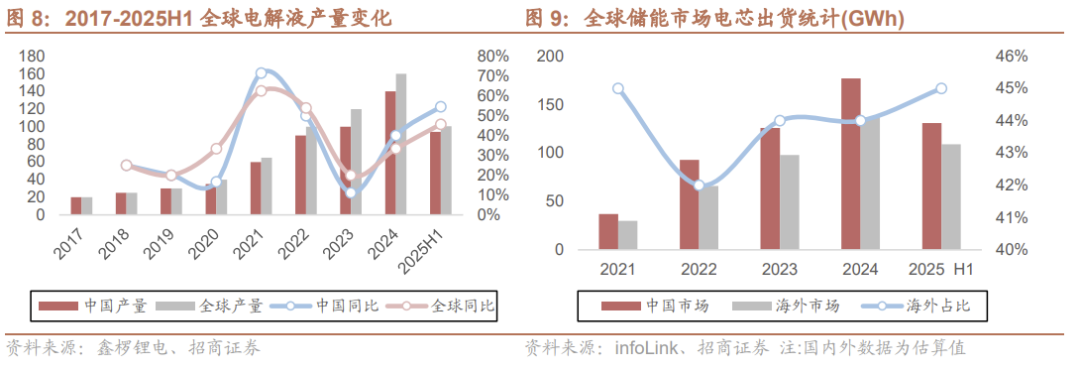 储能或拉动电解液需求高增。2024年全球锂电池电解液出货量达166.2万吨,同比增长26.7%。2025H1,中国电解液出货87万吨,同比增长45%。储能是电池端核心增长动力,受益于国内政策驱动转收益驱动、海外美国大储及各场景涌现,2025H1,全球储能电芯出货 240GWh(同比 106%),预计26年需求持续旺盛。受益于下游储能的快速增长,预计2026年电解液需求有望维持高增速。