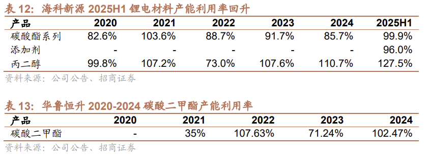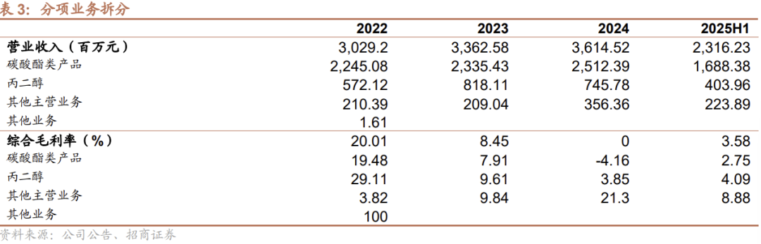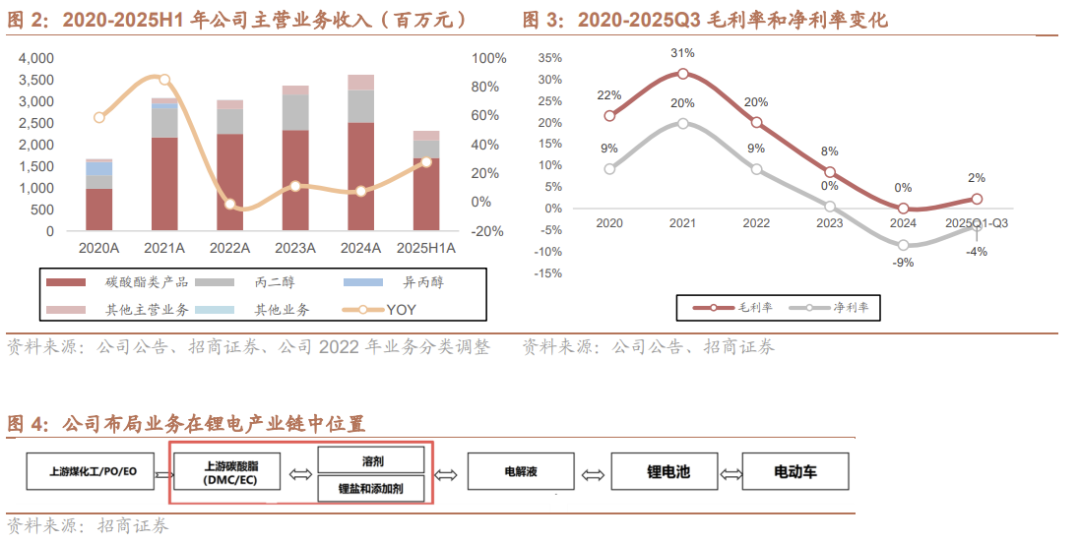 2025 年公司盈利能力逐步修复。2024 年全年毛利率为0%,2025 年 H1 回升至 3.58%,核心业务碳酸酯系列(锂电材料)毛利率 2024年为- 4.16%,2025年转正至 2.75%。
