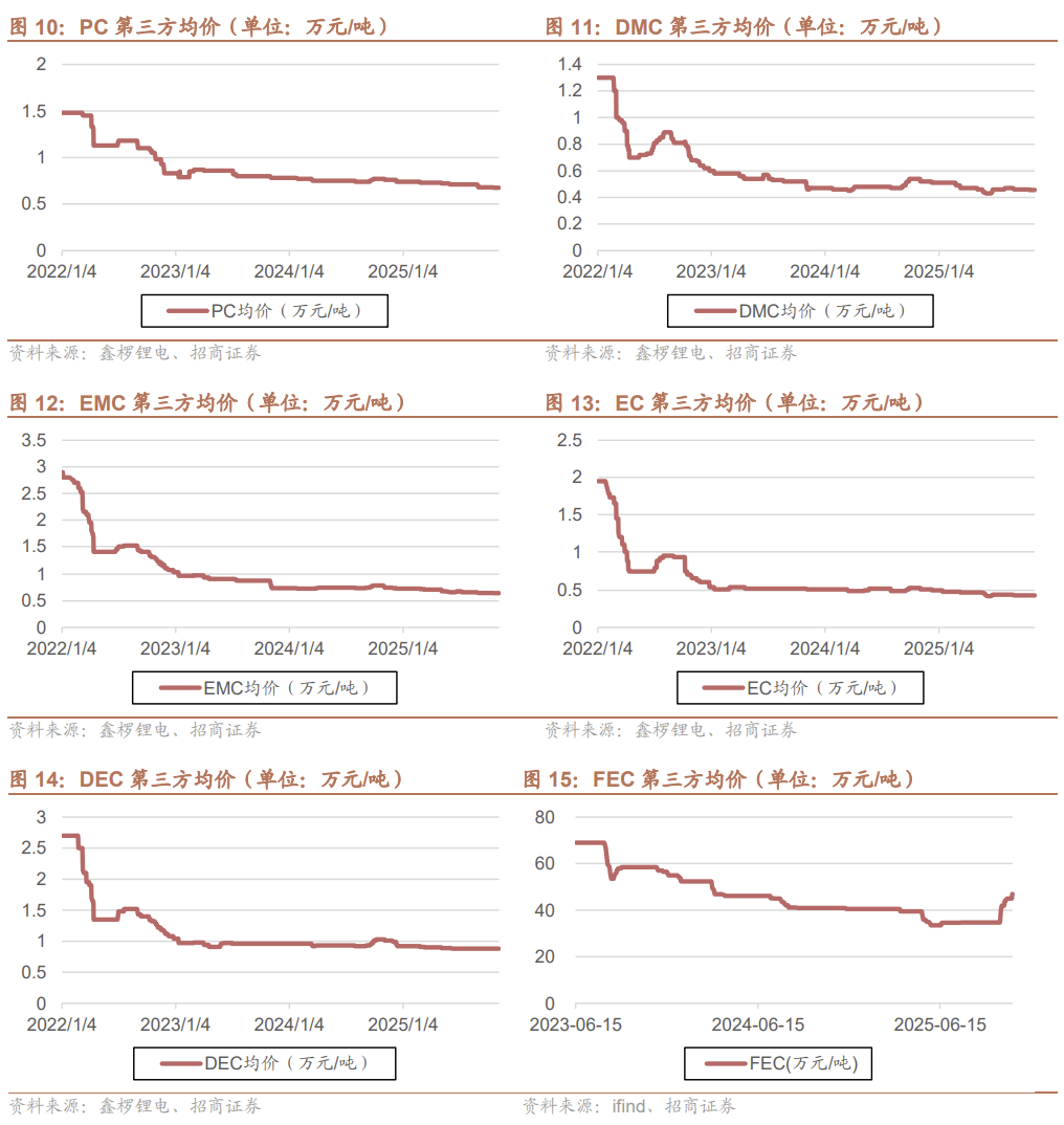 电解液溶剂:目前电解液溶剂有效供给约260万吨,头部企业已经满负荷,尾部企业由于认证问题预计对市场供需影响有限,虽行业仍有部分计划产能,但因成本高等原因,投入概率较低。预计26年行业可能迎来价格上行。其中EC品种产业反馈较为紧张,后续有望涨价有所加速。