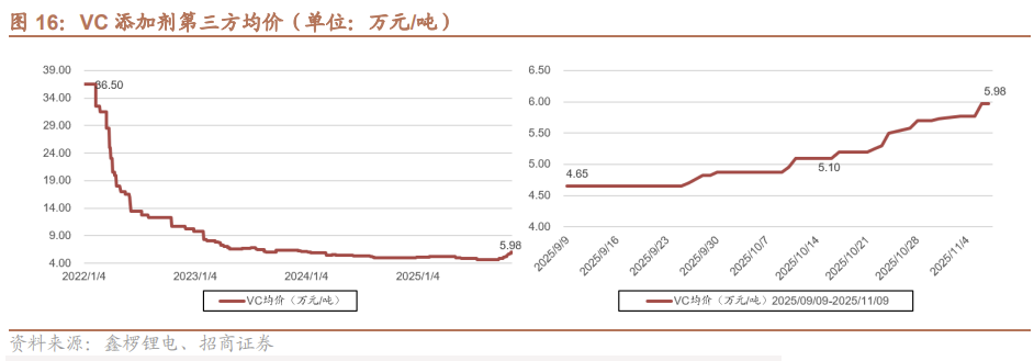 添加剂:目前行业VC有效供给约8万吨,市场已呈现 “需求强、供给紧” 的格局,目前虽价格涨幅较多,但刚接近企业盈亏平衡线,后续行业价格有望加速上涨。VC添加剂行业投资多为计划,实际进度缓慢,且前期山东亘元5万吨VC新产能开工三次均出现安全事故,暂无开工计划,市场供给有限。