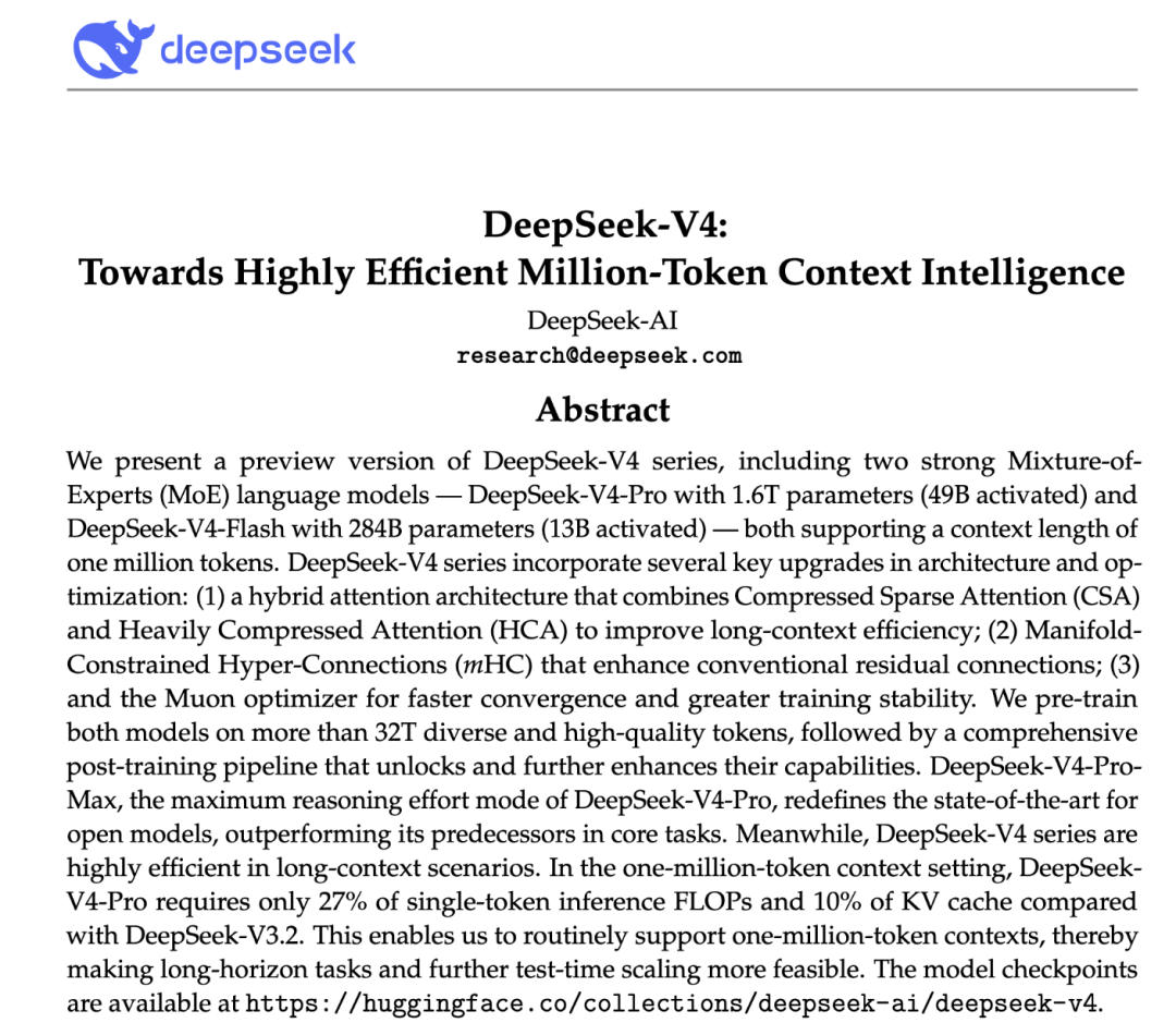 相比DeepSeek‑V3架构,DeepSeek‑V4系列保留DeepSeekMoE框架与多令牌预测(MTP)策略,并引入多项关键架构与优化创新:混合注意力架构大幅提升长上下文处理效率,流形约束超连接(mHC)增强了传统残差连接,提升信号传播稳定性,而Muon优化器加快收敛速度,提升训练稳定性。