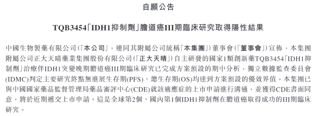 相较于肺癌等大癌种,#胆道癌在抗肿瘤药物领域像是一个被遗忘的角落,长期缺乏针对性的治疗方案及用药。然而最近这个细分赛道迎来了一定突破,今年3月份#中国生物医药(01177)宣布旗下正大天晴研发的针对晚期胆道癌的TQB3454(IDH1抑制剂)获得了Ⅲ期临床成功,且近期会正式申报上市。