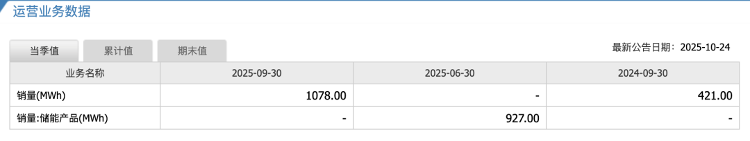 2025年前三季度,公司实现销售2,405MWh,同比增长142.44%;其中第三季度实现销售1,078MWh,同比增长156.06%。