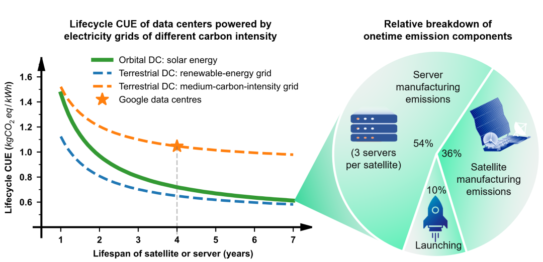 通过这一模型进行的初步建模分析表明,尽管轨道数据中心在制造和发射环节会产生显著的「一次性」碳排放,但凭借其在轨运行期间持续的碳中和优势,从全生命周期的角度看,其碳效率有望超越依赖中等碳强度电网的地面数据中心,并逐步逼近由全可再生能源供电的先进地面数据中心的水平。