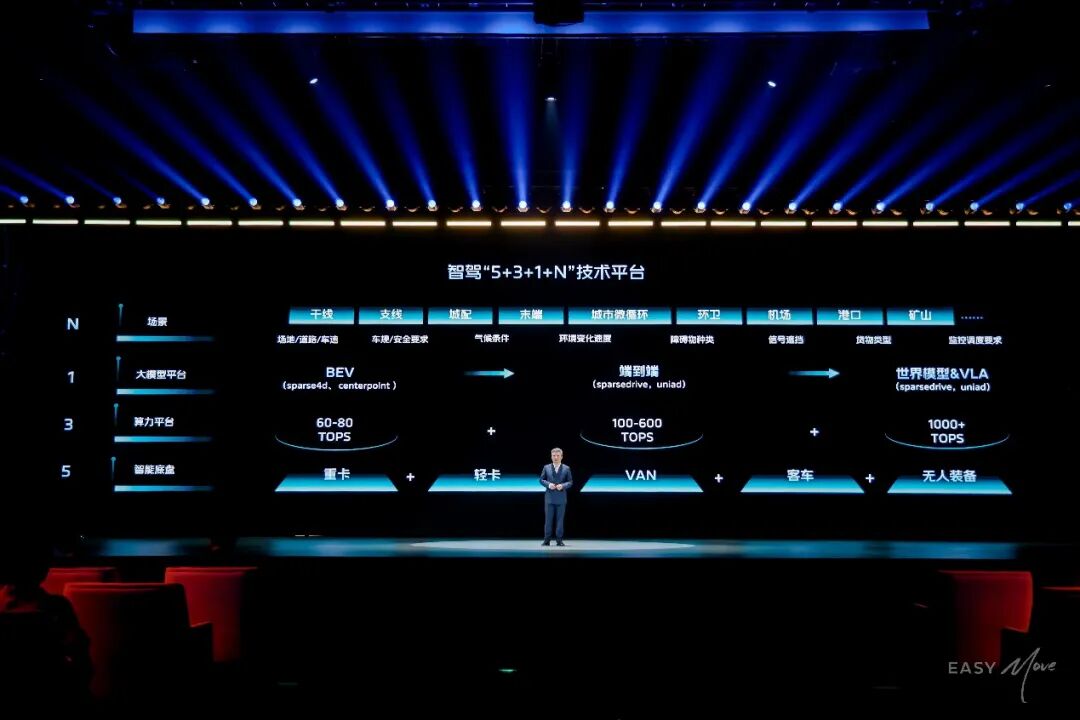 福田汽车打造了 "5 3 1 N" 智驾技术平台:"5" 涵盖重卡、轻卡、VAN、客车和无人装备 5 类智能线控底盘;"3" 提供 60-80TOPS、100-600TOPS、1000 TOPS 三个不同算力平台;"1" 是统一的智能化大模型平台,以端到端为基础,后续逐步拓展到VLA和世界模型;"N" 则代表干线、支线、城配、末端、城市微循环以及机场、矿山、园区等全场景智驾应用落地。