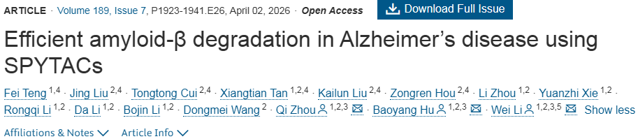 2026 年 4 月,国际顶级期刊Cell发表了中国科学院动物研究所李伟、胡宝洋、周琪团队的重磅研究成果,研究团队开发出下一代胞外靶向蛋白降解(eTPD)平台——合成多肽编程的溶酶体靶向嵌合体(synthetic peptide-programmed lysosome-targeting chimeras,SPYTACs),凭借全合成双特异性多肽的独特设计,不仅实现了外周与中枢神经系统的协同Aβ高效降解,更从根本上规避了传统抗体疗法的核心安全风险,为 AD 治疗带来了全新的范式。