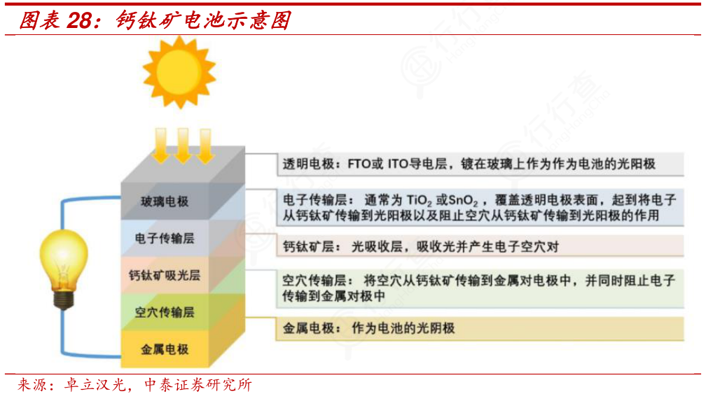 钙钛矿电池,是依靠钙钛矿(CaTiO₃)结构材料进行光电转换的一种新型光伏电池,它属于第三代太阳能电池。按结构形式不同,可分为单结钙钛矿电池和叠层钙钛矿电池。