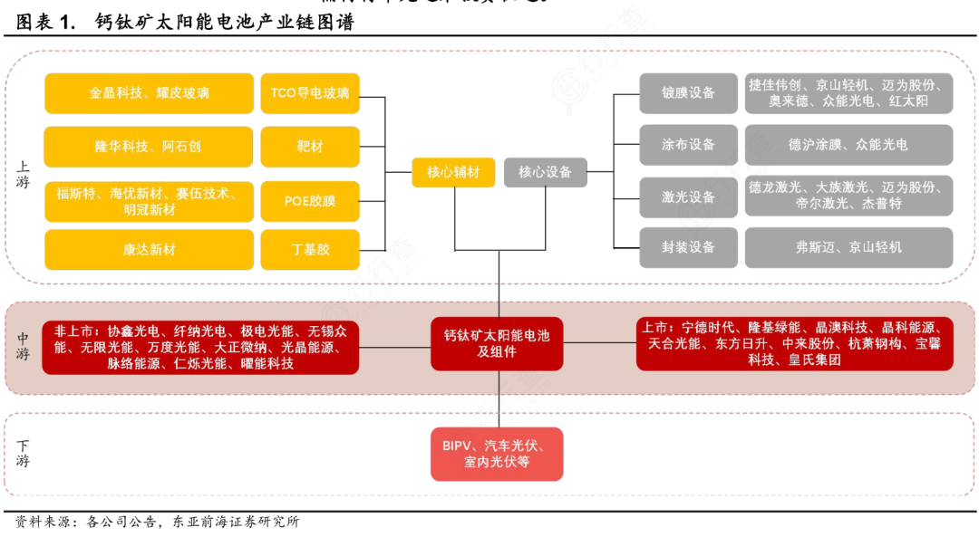 聚焦核心辅材与核心设备,核心辅材涵盖TCO导电玻璃、靶材、POE胶膜、丁基胶等,这些材料是钙钛矿电池生产的物质基础,决定了电池的基础性能与封装质量。核心设备包含镀膜设备、涂布设备、激光设备、封装设备等,为电池的规模化制备提供工艺保障,其精度与稳定性直接影响电池的量产效率与品质一致性。