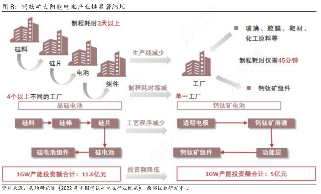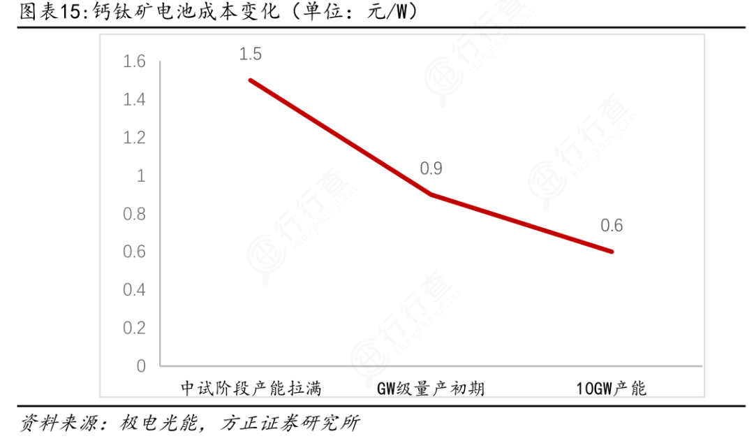 材料成本方面,钙钛矿原材料价格低廉,材料成本仅为晶硅的1/20,吸光层厚度仅需300-500nm,用量极少。生产方面,可通过溶液印刷、刮刀涂布等低温工艺制备,生产能耗仅0.12-0.23kWh/W,为晶硅电池的 1/8-1/13,GW级量产后组件成本有望降至0.5-0.6元/W。
