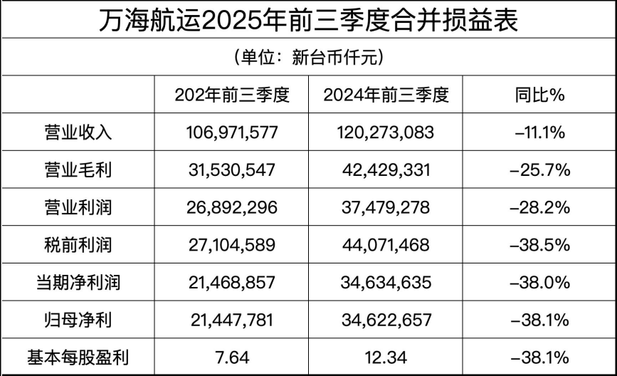 2025年前三季度,万海航运累计实现营业收入新台币1069.7亿元(约34.3亿美元),同比下降11.1%;毛利为315.3亿新台币(约10.1亿美元),同比下降25.7%;营业利润为268.9亿新台币(约8.6亿美元),同比下降28.2%;税前净利为271.0亿新台币(约8.7亿美元);前三季度净利214.7亿新台币(约6.9亿美元),同比下降38.0%;归属于母公司的净利润为214.5亿新台币(约6.9亿美元);每基本股盈利7.64新台币。
