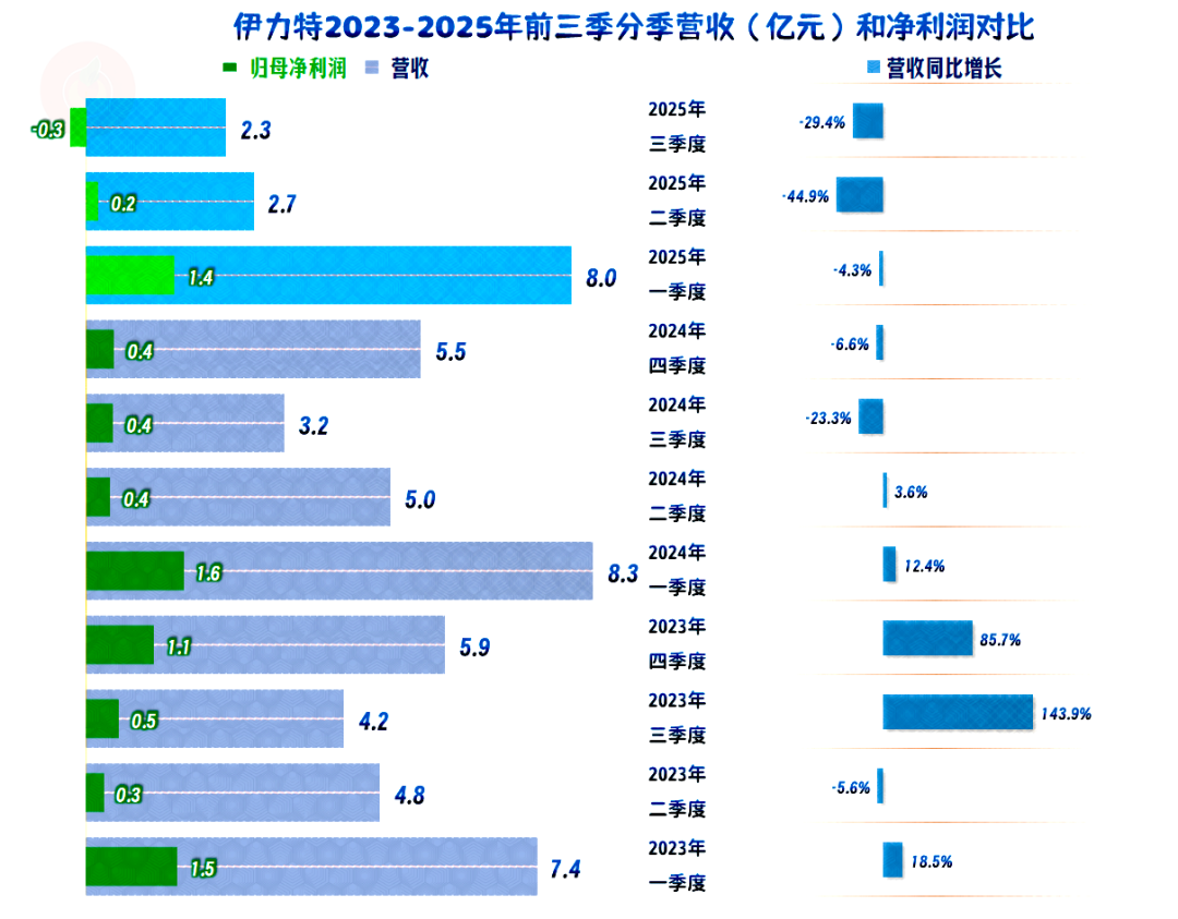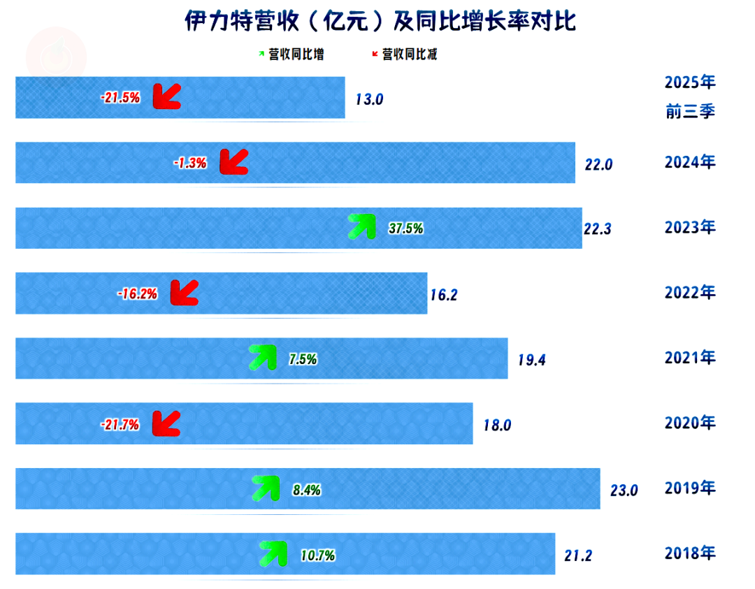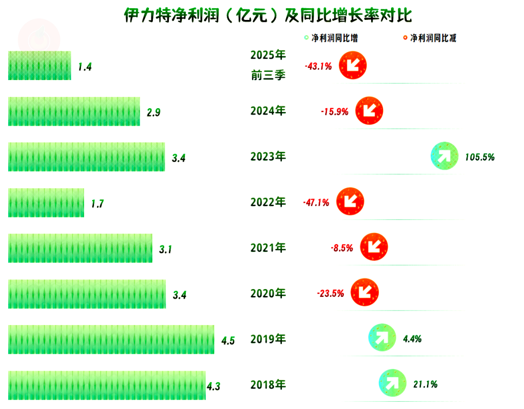 2025年前三季度,伊力特的营收同比下跌两成多,比2024年的下跌有明显加速的迹象。这并不是他们首次下跌了,除了2020年疫情突然爆发,当年下跌也是超过两成之外,2022年也出现了16.2%的较大幅度下跌,也就是说其营收下跌已经成为较为常见的现象。从2020年以来,其规模都没有超过2019年,也就是疫情前的水平,对现在的经营形式,他们是早就有心理准备的。