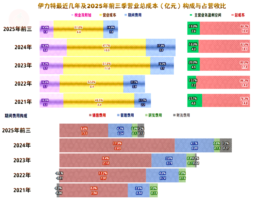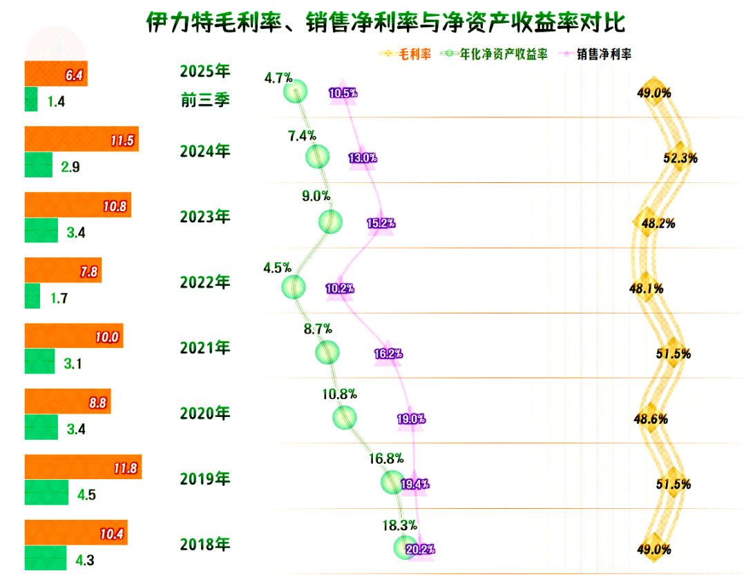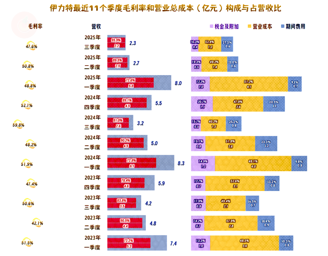 伊力特的毛利率在50%左右,这和我们看过的其他很多品牌的毛利率相比要低很多。不过,高低总是相对的,和其他一些传统行业相比,这也是暴利。2025年前三季度,49%的水平并不算这些年最低的,至少有三年都低于这一水平。
