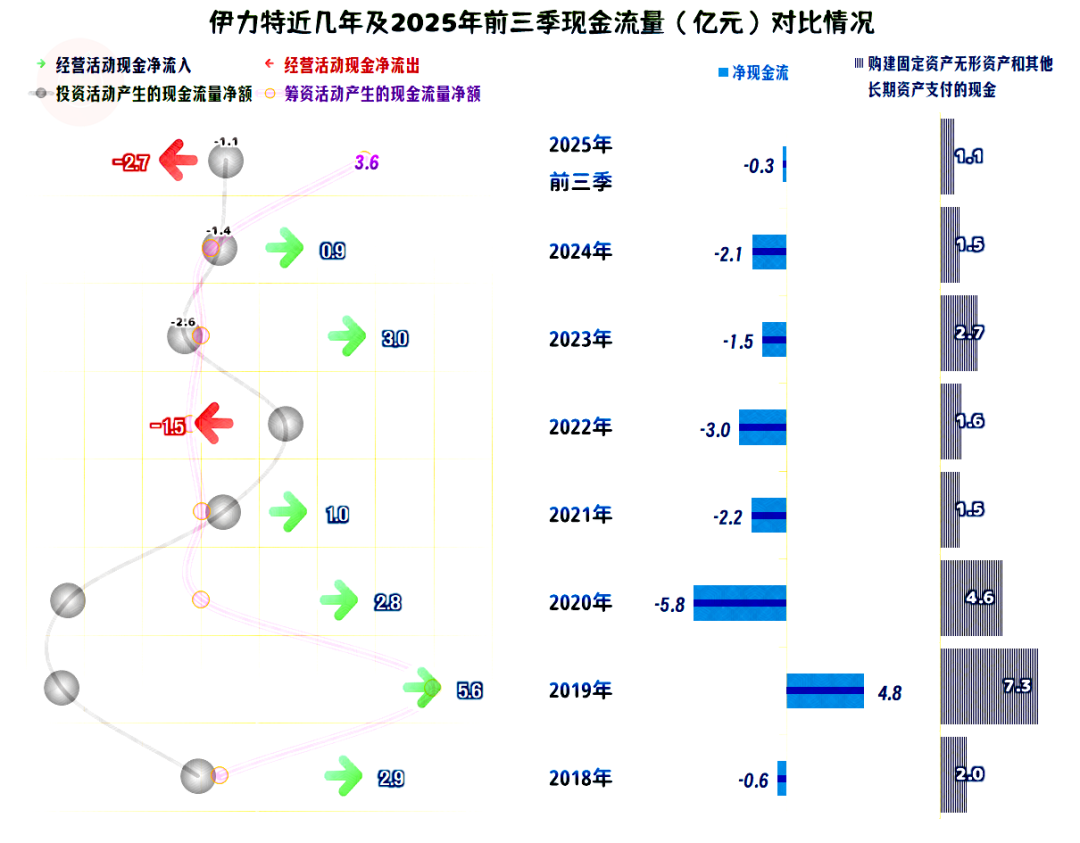 在2022年,也出现过经营活动的现金流净流出的情况,2025年前三季度是更大金额的净流出,其他年份都能够维持净流入的状态,只是流入的金额已经远不及2019年了。至于说固定资产类的投资,我们一致认为这并不重要,对伊利特来说,仍然是这个态度。