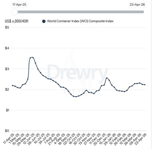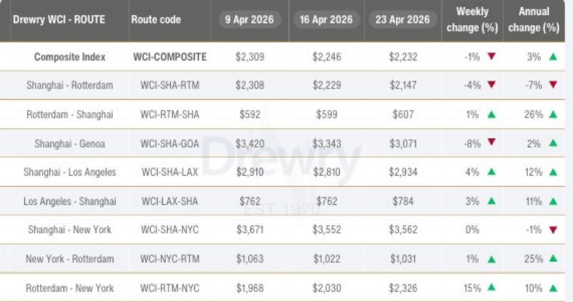 截至4月23日,Drewry世界集装箱运价指数(WCI)下跌1%至2232美元/FEU。