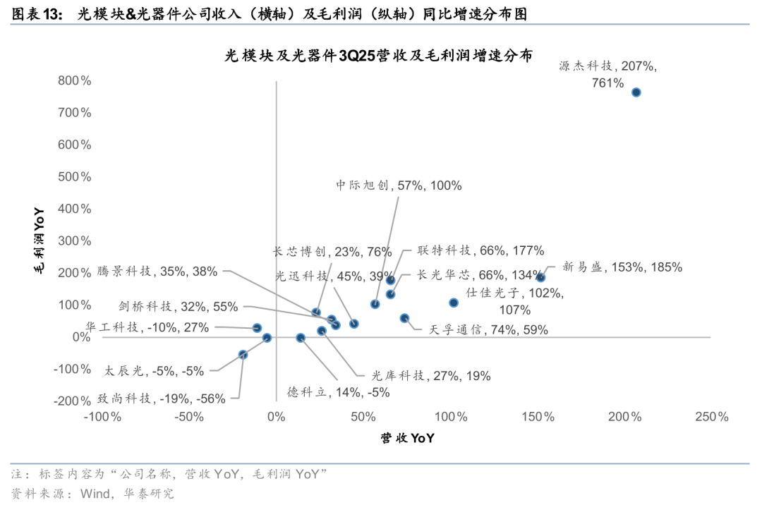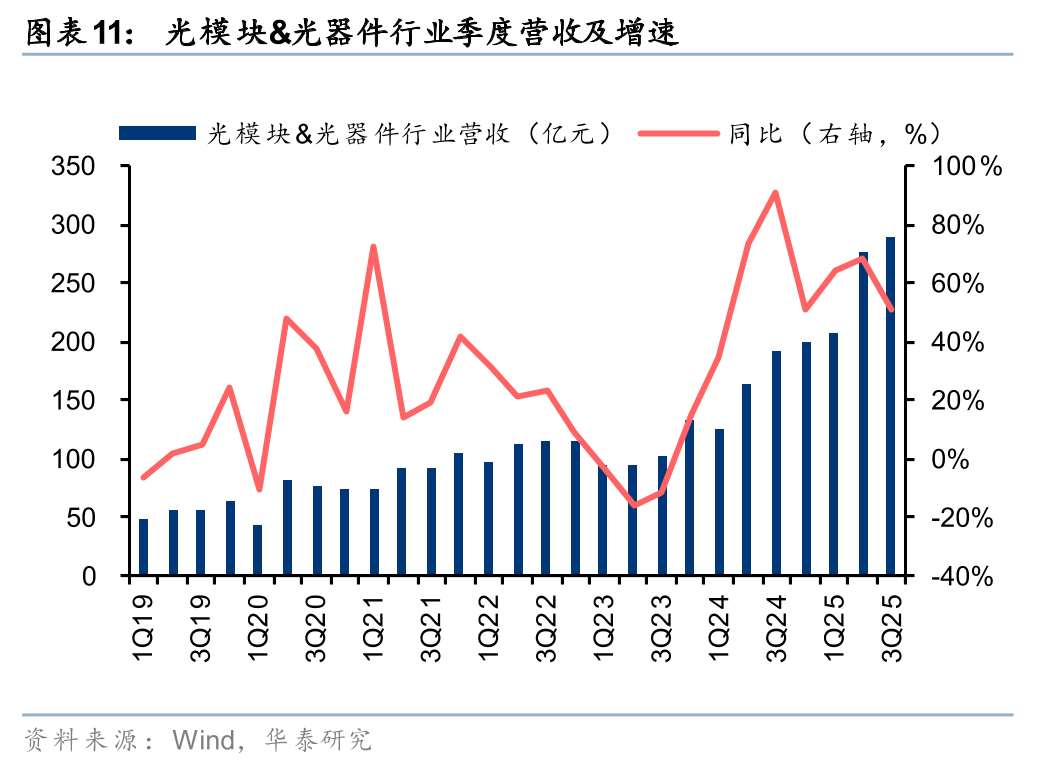 3Q25光模块及光器件板块总营收/归母净利润分别同比增长51%/123%,其中中际旭创归母延续环比快速增长,主要受益于海外800G光模块需求持续释放,以及1.6T产品的起量;新易盛环比增速短期放缓,我们判断主因部分客户提货节奏影响。源杰科技受益于CW光芯片需求的快速提升,归母保持环比高增态势。另一方面,光器件板块(天孚通信、太辰光、长芯博创等)Q3归母净利润环比波动,我们认为主要因下游客户提货节奏影响。未来随着800G以及1.6T光模块需求的进一步释放,我们预计光器件板块归母有望呈现逐季度回暖。国内链方面,Q3华工科技、光迅科技等厂商光通信业务延续快速增长,主因国内400G光模块需求的带动,后续国内800G光模块需求亦有望起量。