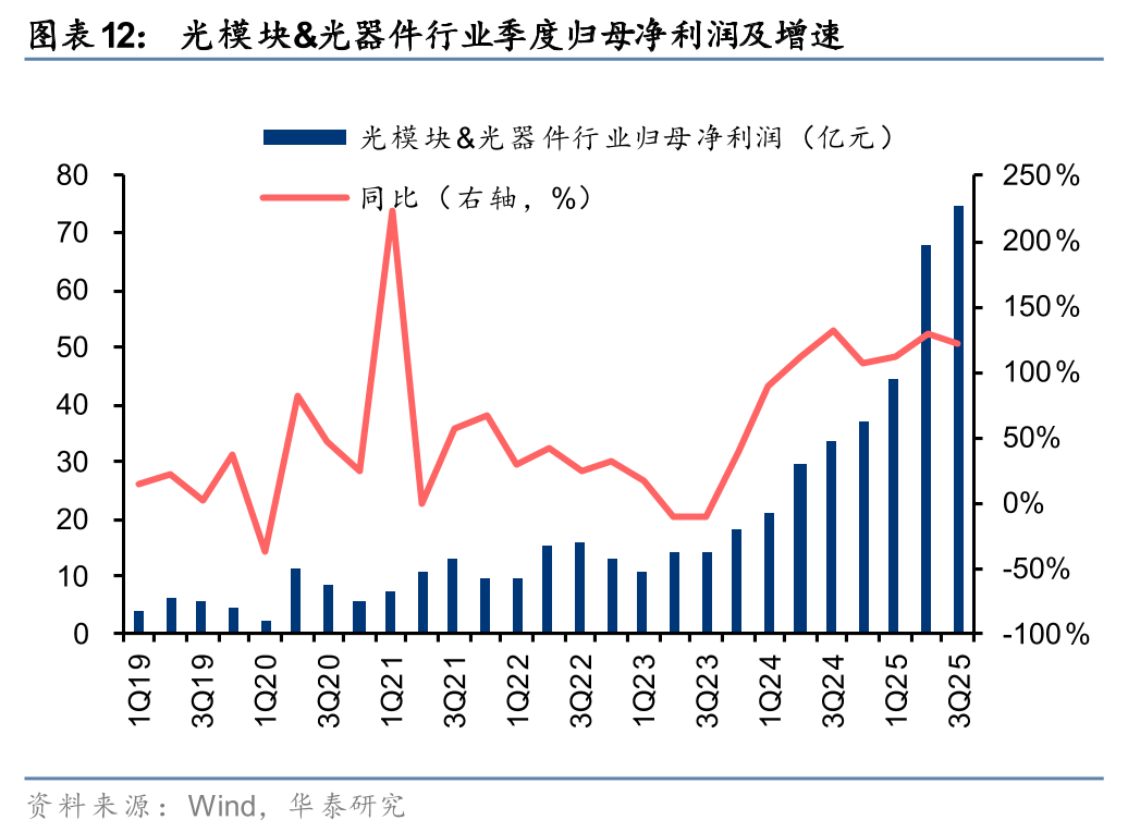 3Q25光模块及光器件板块总营收/归母净利润分别同比增长51%/123%,其中中际旭创归母净利润延续环比快速增长,主要受益于海外800G光模块需求持续释放,以及1.6T产品的起量;新易盛归母净利润环比增速短期放缓,我们判断主因部分客户提货节奏影响。源杰科技受益于CW光芯片需求的快速提升,归母净利润保持环比高增态势。另一方面,光器件板块(天孚通信、太辰光、长芯博创等)Q3归母环比波动,我们认为主要因下游客户提货节奏影响。未来随着800G以及1.6T光模块需求的进一步释放,我们预计光器件板块归母有望呈现逐季度回暖。
