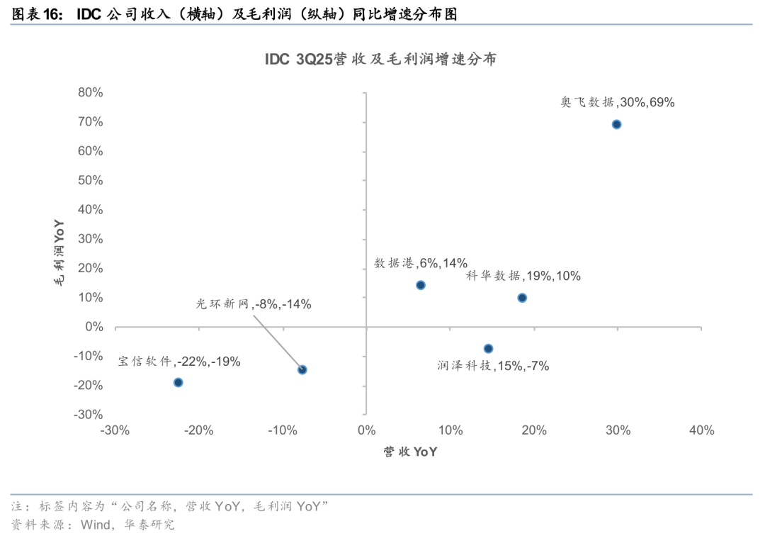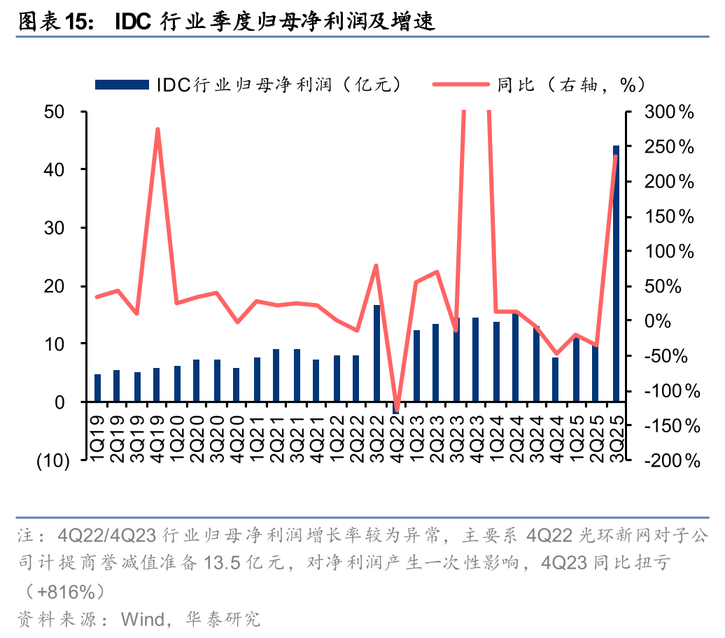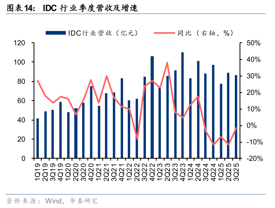 3Q25 IDC板块总营收/归母净利润分别同比-1.6%/ 236%,一方面,国内AI芯片供给受限使得部分项目上架及收入增长受到影响;另一方面,公募REITS项目顺利发行,为盘活存量资产、开拓融资渠道提供了新的可能性。我们观察到AI需求的带动下数据中心行业需求景气度明显提升,但短期内部分数据中心项目上架进度或受到AI芯片短缺的影响,展望2026,随着国产AI芯片产能逐步提升,芯片短缺问题或将逐步得到缓解。此外,润泽科技、万国数据顺利完成两单公募数据中心REITS项目的发行工作,润泽在Q3、万国在Q2分别确认股权处置收益37.59亿元、10.57亿元,对优化资本结构、助力数据中心基础设施的后续持续扩张起到重要作用。