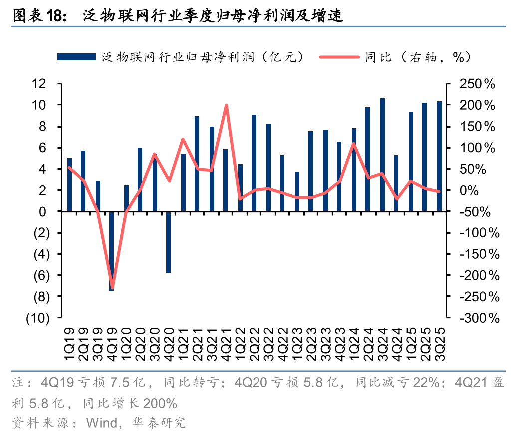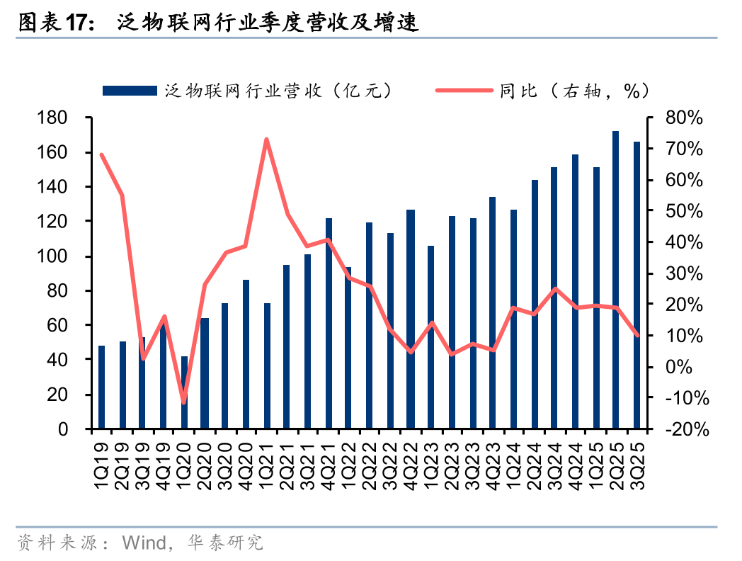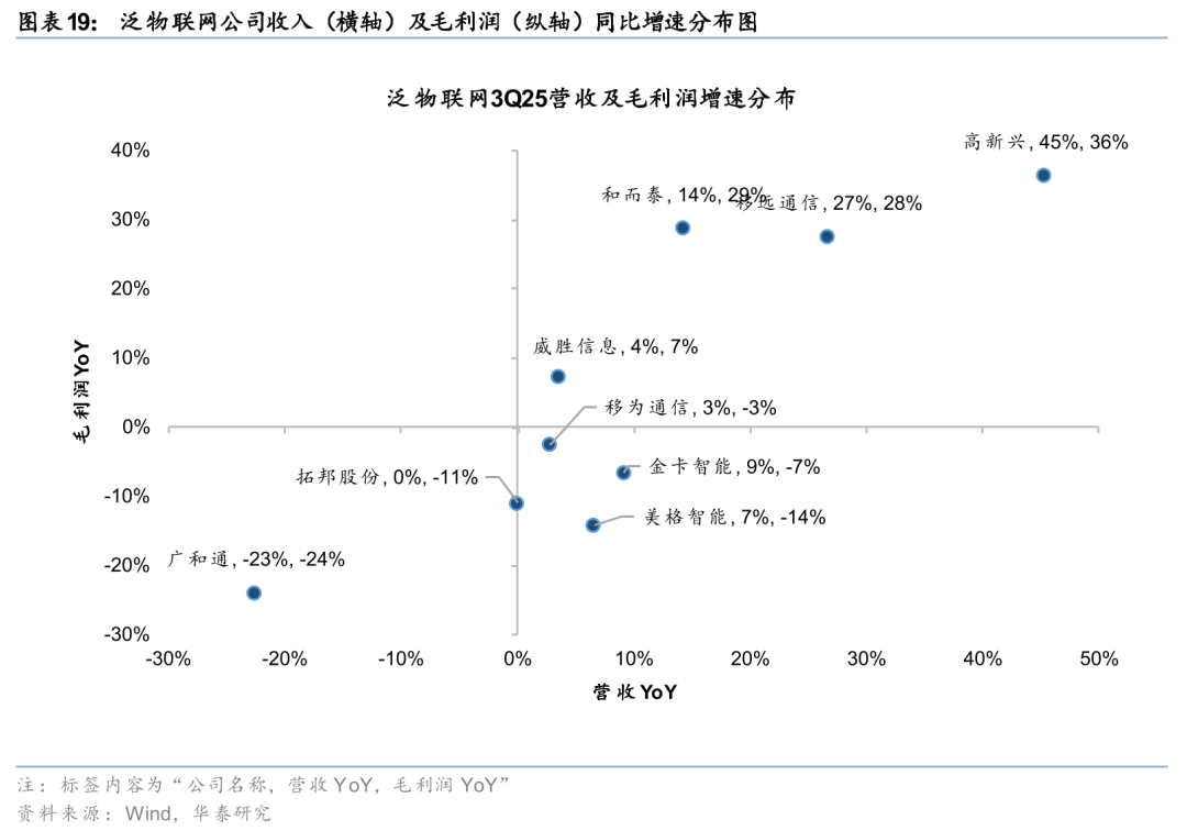 3Q25泛物联网板块营收/归母净利润分别同比 9.9%/-2.9%。分板块来看,3Q25物联网模组板块(移远通信、广和通、美格智能)归母环比-2%,其中移远通信稳健增长;广和通、美格智能Q3环比承压,我们认为主要因国内车载市场需求的短期承压。我们继续看好板块未来有望受益于端侧AI产业机遇;智慧电网方面,威胜信息Q3延续稳健增长,在手订单充沛。智慧燃气方面,金卡智能收入稳健增长。
