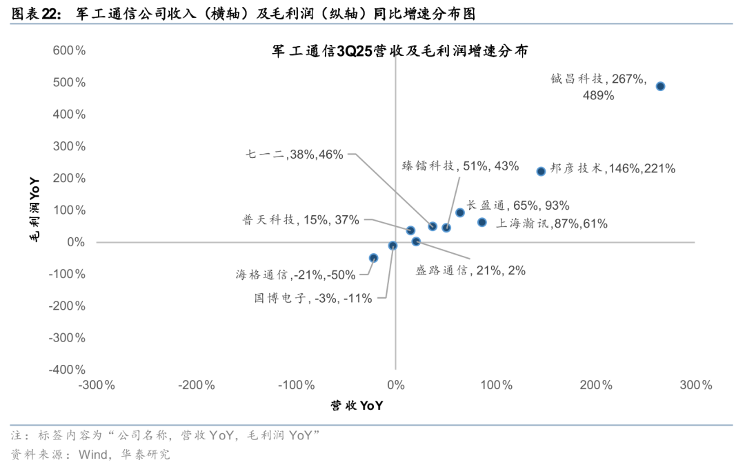 3Q25军工通信板块营收/归母净利润分别同比 10%/ 19%。3Q25军工通信板块总营收为39.46亿元,同比 9.78%;实现归母净利润-1.16亿元,同比 19.04%。3Q25板块综合毛利率为27.19%,同比 0.13pct。从三季度情况看,板块公司归母表现有所分化:上游企业(铖昌科技、臻镭科技、长盈通等)归母净利润呈现快速增长态势;中游通信设备商与系统集成商(海格通信、上海瀚讯、国博电子等)中,部分企业单季度营收有所恢复,但受费用率高企影响,利润端仍承压。展望26年,伴随军工“十五五”新建设周期启动,以及卫星、无人、低空等新质领域快速发展,板块有望迎来复苏。我们看好军工信息化从装备信息化向系统/体系信息化转变,军用通信作为先行基础设施,有望长期受益于我国军工信息化建设。