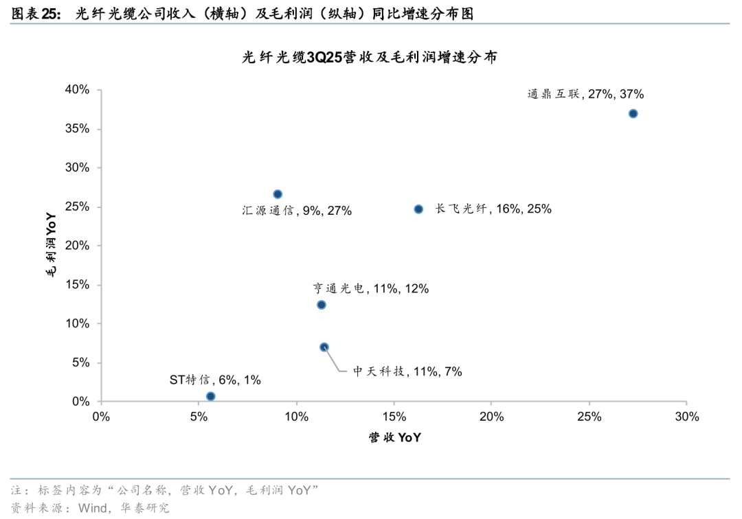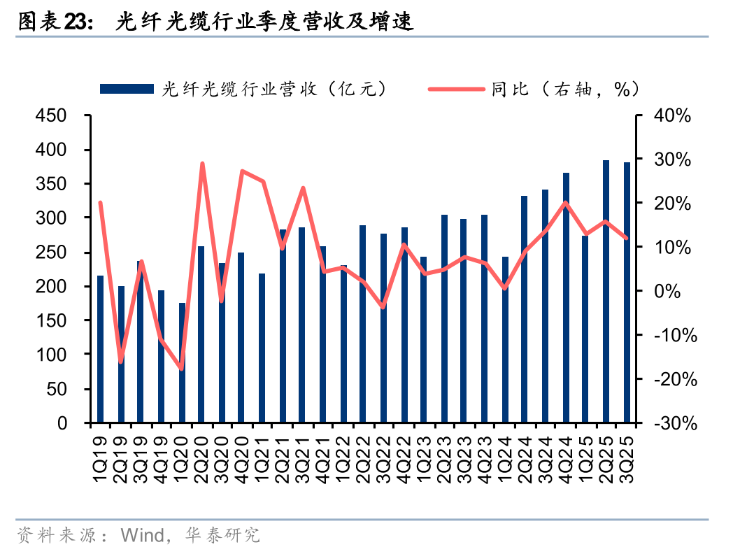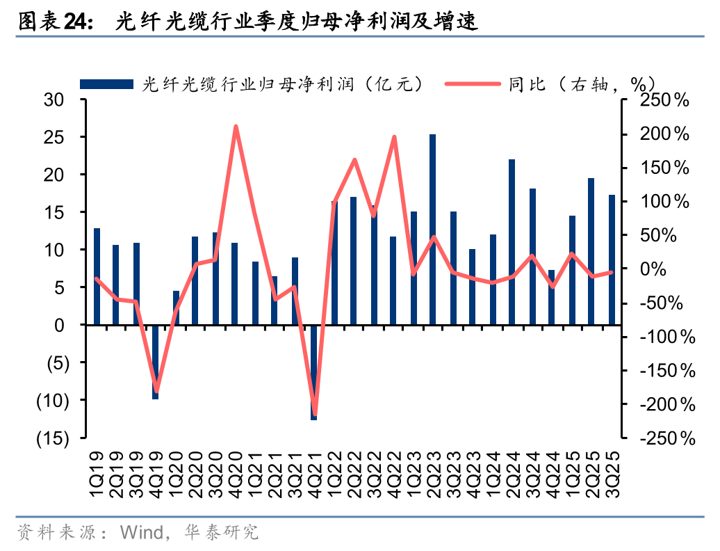 3Q25光纤光缆板块营收/归母净利润分别同比 12%/-4%。3Q25光纤光缆板块总营收为380.98亿元,同比 11.99%;实现归母净利润为17.40亿元,同比-3.82%。3Q25板块综合毛利率为15.36%,同比 0.14pct。3Q25光纤光缆板块营收保持稳健增长,AI算力驱动下,光纤光缆产品结构优化,虽然国内电信侧传统光纤需求短期承压,但面向算力网络的高端产品需求旺盛;海缆方面,亨通光电等在手订单丰沛,海洋项目业绩持续兑现。展望未来,随着AI算力建设的发展,数据中心互联(DCI)对空芯光纤、多模光纤等高端光纤产生新需求;受益于深海科技政策催化,深远海风电及海底观测网等有望加速发展。