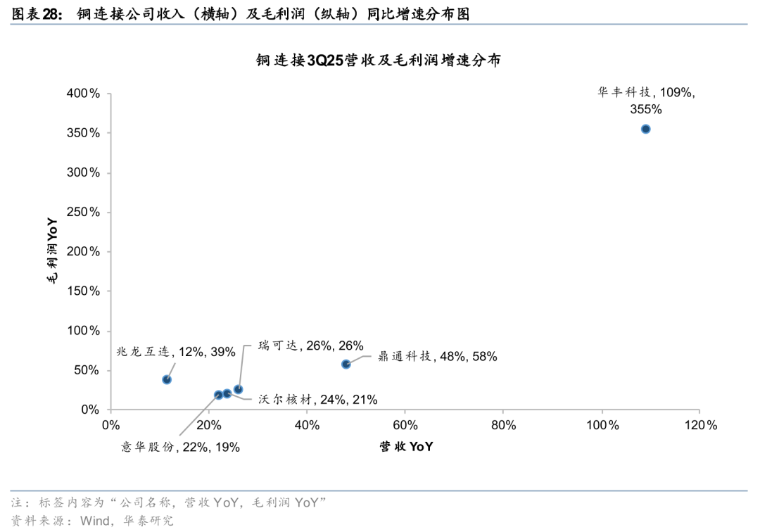 3Q25铜连接板块营收/归母净利润分别同比 26%/ 72%。3Q25铜连接板块总营收为57.52亿元,同比 26.39%;实现归母净利润为5.74亿元,同比 72.49%,归母净利润释放主因AI相关新产品规模化导入带来毛利增长、费用下降,3Q25铜连接板块毛利润同比增长34%。从重点公司来看,华丰科技3Q25营收/归母净利润分别同比增长109%/336%,但归母环比下滑39%,主因本代高速线模组产品在量产后客户有一定调价要求,导致公司Q3毛利率环比下滑,我们预计公司面向下一代GPU设计的新型高速线模组产品有望完成速率升级、产品架构迭代,同时公司高速线模组产品客户有望“从一到十”,全面参与国产超节点Scale-up互联;沃尔核材3Q25营收/归母净利润分别同比增长24%/12%,我们看好公司高速通信线产品持续受益海内外超节点建设,随着公司采购的关键发泡设备在25年底陆续到货,公司26年有望坐拥设备存量优势,若GB300等机柜大量出货,则在行业产能偏紧的背景下公司有望分得更多份额,从而带来归母加速释放。