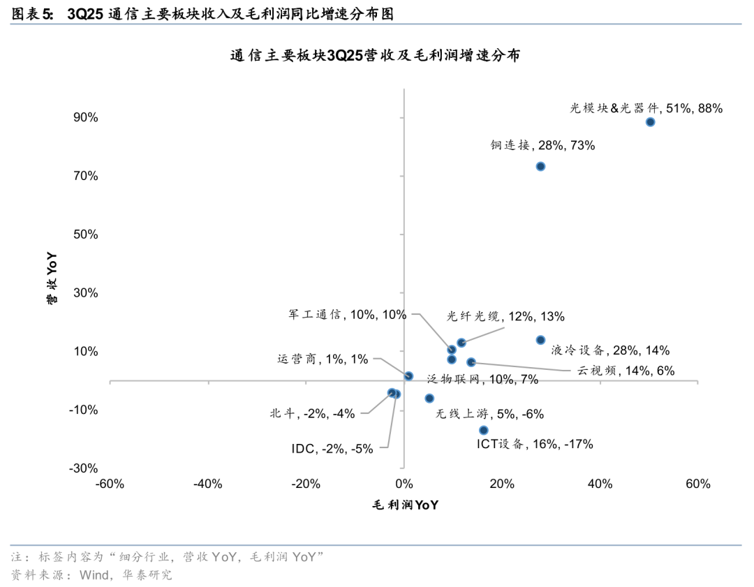 以我们选定的137家通信板块上市公司为样本, 3Q25通信行业合计营收/归母净利润分别同比增长5.2%/12.3%,整体延续稳健增长态势。细分来看,电信运营商归母延续稳健增长;光通信、铜连接板块中头部厂商AI归母持续兑现;液冷设备/ICT设备收入企稳回暖。展望4Q25及2026年,我们认为全球AI算力侧投资加码有望驱动光通信板块归母净利润延续高增长;电信运营商板块归母预计保持稳健增长;ICT设备及IDC板块有望持续受益互联网巨头资本开支增长;铜连接板块有望持续释放产能从而兑现归母增长;光纤光缆中空芯光纤、海缆、DCI需求值得关注。