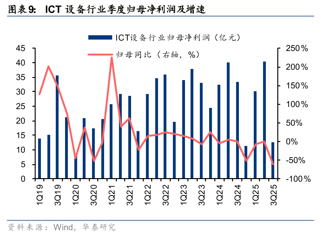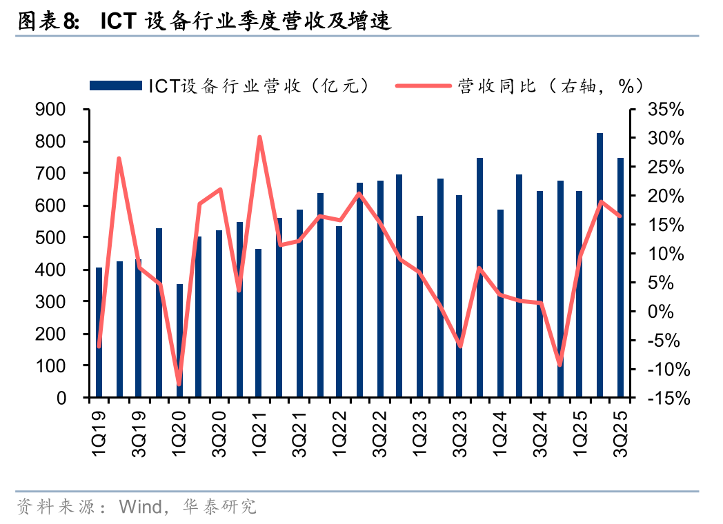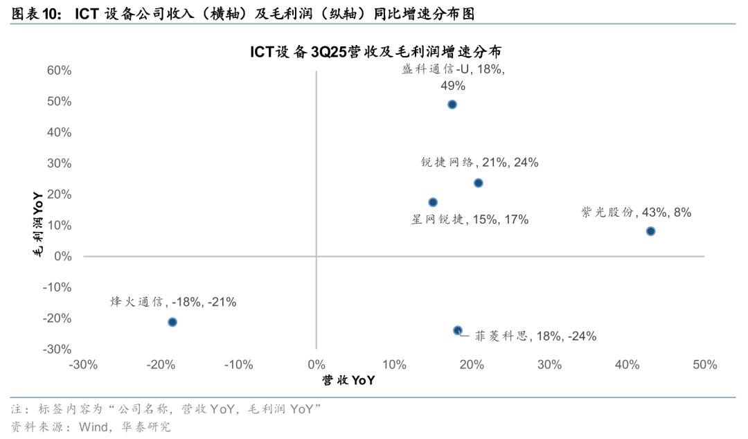 3Q25 ICT设备板块营收/归母净利润分别同比增长 16%/-62%。3Q25 ICT设备板块总营收为749.68亿元,同比增长16.4%;实现归母净利润合计12.72亿元,同比下降62%,若剔除权重股中兴通讯的影响,则ICT设备3Q25总营收为460亿元,归母净利润为10亿元,同比分别变动 25%/-16%。从头部厂商来看,中兴通讯3Q25单季度营收/归母净利润分别为289.67/2.64亿元,分别同比 5%/-88%,利润下滑主因公司高毛利率的运营商业务收入同比下滑、占比降低,而收入结构偏向于低毛利率算力业务。