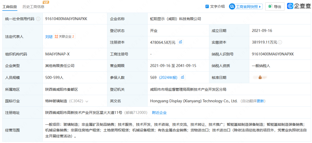 资料显示,虹阳显示成立于2021年9月,经营范围包括玻璃制造、非金属矿及制品销售、智能基础制造装备制造等。虹阳显示由彩虹股份、建信金融资产投资有限公司、咸阳金财股权投资合伙企业(有限合伙)、中银金融资产投资有限公司共同持股。