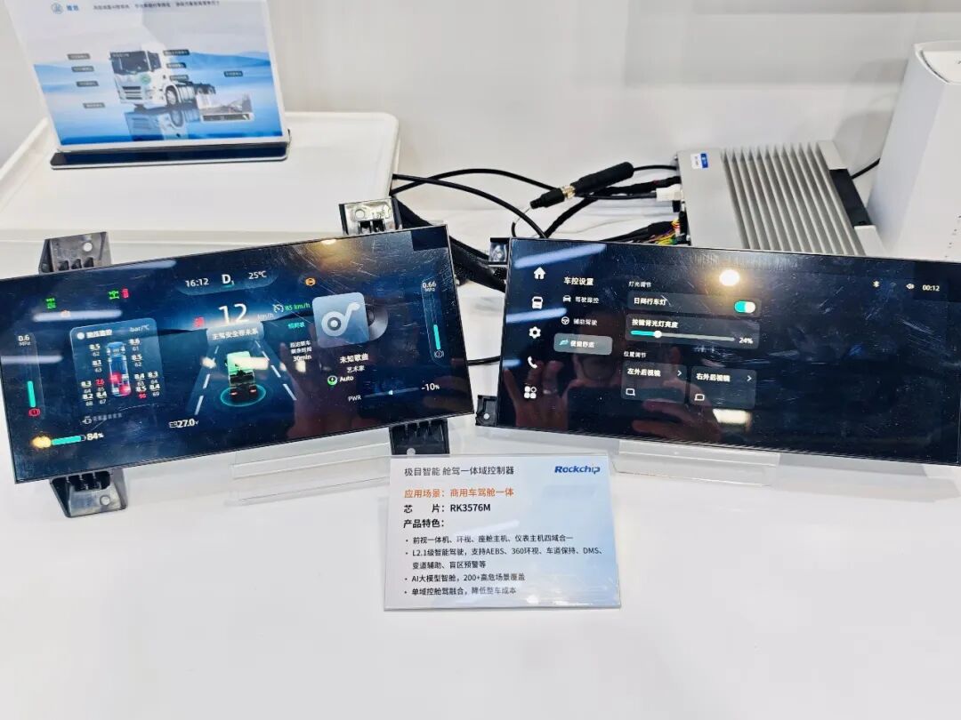 此外,展出的RK3576M系列智能座舱域控平台在乘用车及商用车上均已上车量产,在硬隔离方案的加持下,实现了单芯片驱动3D仪表和中控娱乐的双系统方案。该方案不仅整合了丰富的本地与在线多媒体服务,还集成了DMS(驾驶员监控系统)、AVM(全景环视)、BSD(盲区检测)、轻量级L2-AEBS/AP等等辅助驾驶功能,显著提升了行车安全性。