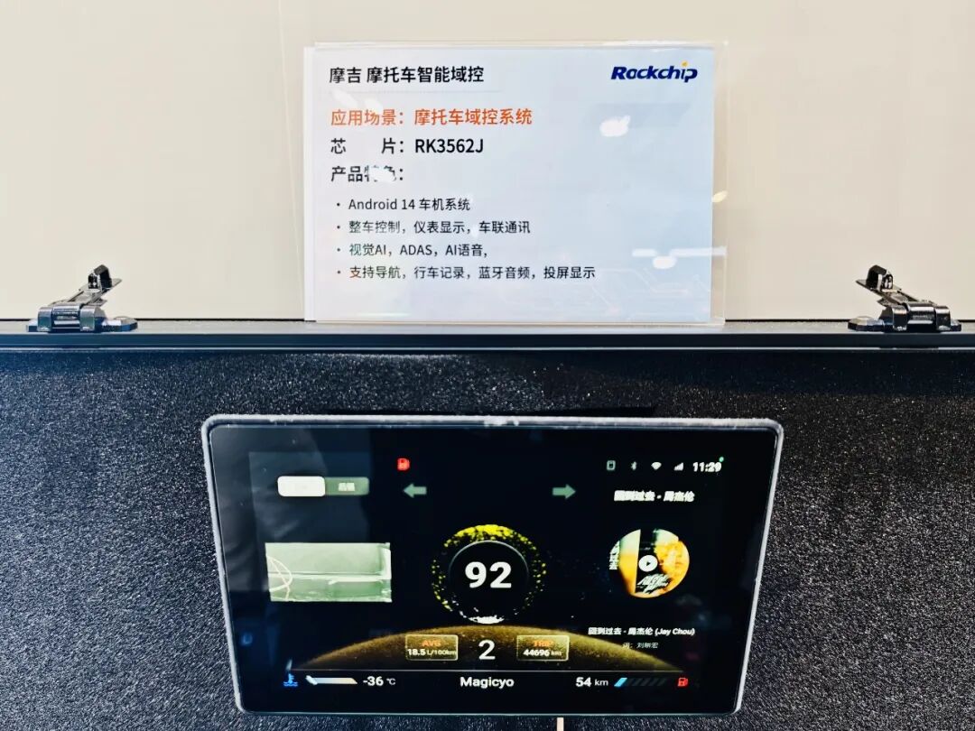 在备受瞩目的智能座舱展区,瑞芯微展出两辆实车搭建的体验场景,观众可沉浸式感受国产车规级芯片的性能实力。基于RK3588M的单芯片舱网域控车型已实现量产,提供94K DMIPS 6TOPS算力,用于AI智能中控与副驾影音交互应用,集成高清Car-DVR、AVM、DMS和OMS等摄像头,端侧部署的AI识别和AI大模型部署能力,大幅提升舱驾融合的交互体验。RK3588M具备突出的3D渲染能力,在1080P的曼哈顿离屏ES3.0测试中可达平均128fps,支持城市NOA和泊车APA的流畅呈现,并集成HUD、AI副驾屏、流媒体后视镜、投影大灯等功能。
