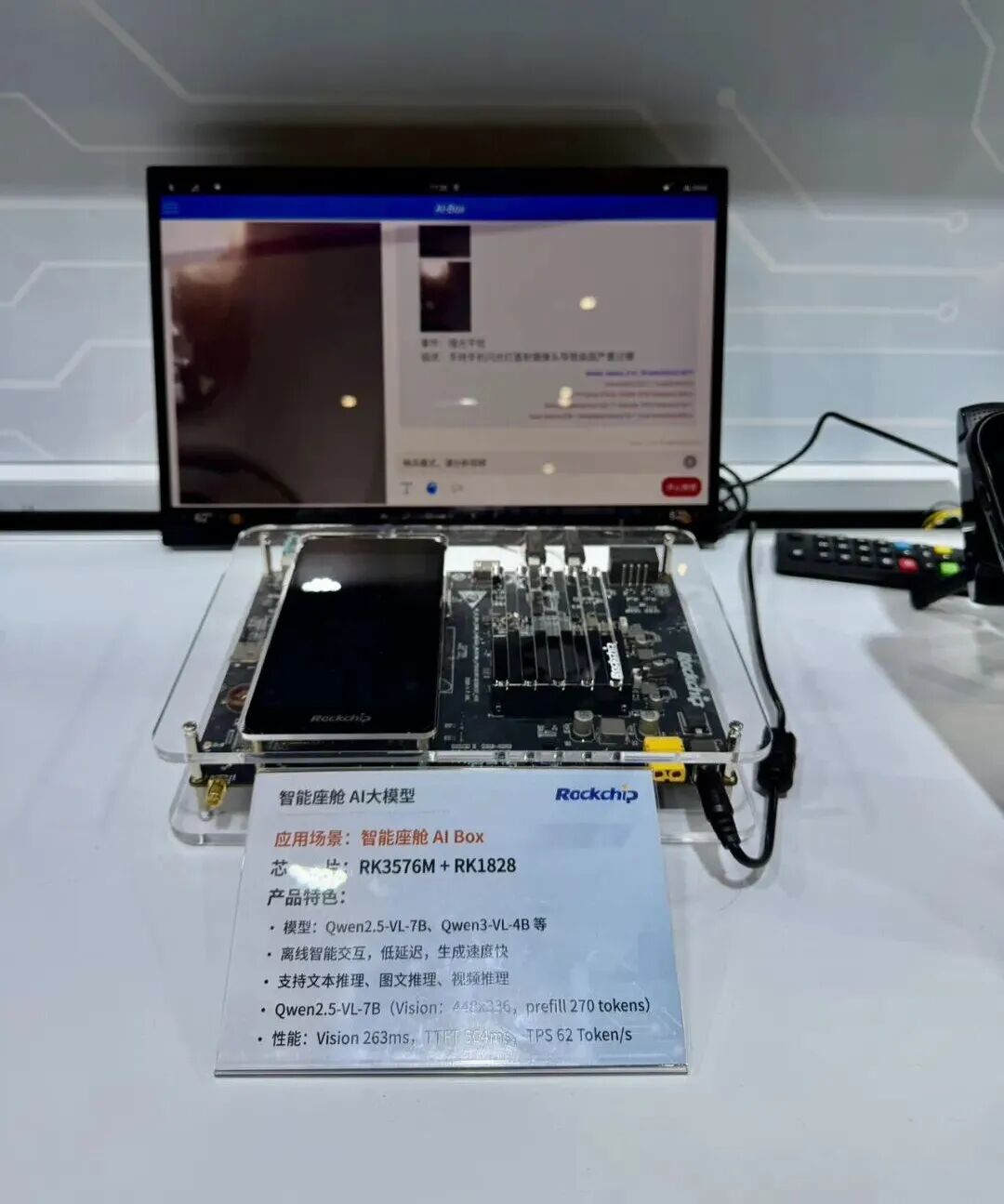 车载AI Box是本次车展的重磅技术亮点,瑞芯微展出了多款基于RK3576M RK1828分布架构来运行应用和端侧大模型的案例。该方案端侧部署了千问、MiniCPM等业界主流AI大模型,支持语音、文本、图片、视频等多模态场景应用。