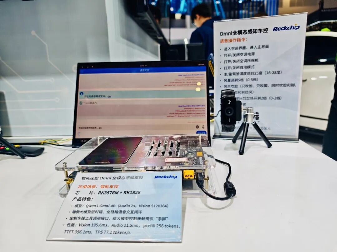 此外,瑞芯微还展示了最新的Omni全模态感知智能车控方案,将大模型从“聊天工具”真正升级为“座舱大脑”。该方案基于Qwen3-Omni-4B模型,实现了多传感器输入、低时延的全模态感知、全链路语音交互闭环、超过80 tokens/s的连贯输出。通过定制车控工具调用接口,为大模型控制座舱提供了灵活的“手脚”,精准调用各类车控功能。