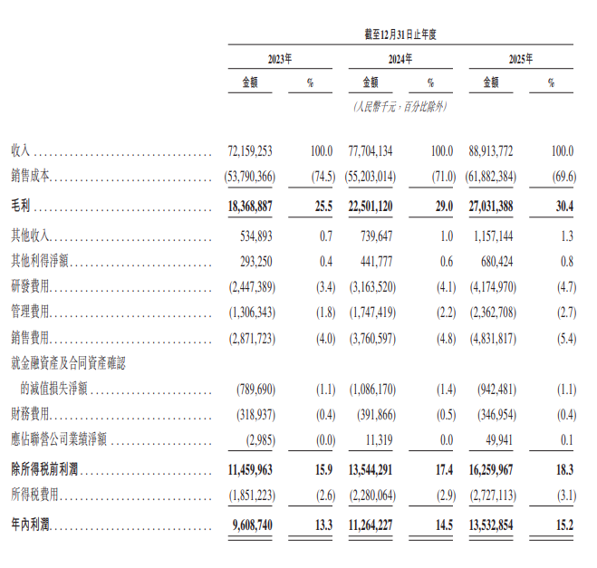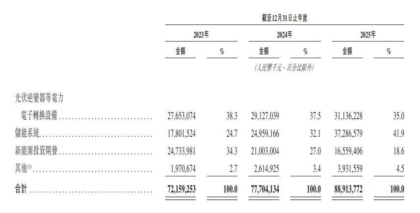 或由于会计准则不同,阳光电源港股IPO财务数据与A股年报数据略有不同。港股IPO申报稿显示,于2023年、2024年及2025年,公司营业收入分别为721.59亿、777.04亿及889.14亿元;净利润分别为96.09亿元、112.64亿元及135.33亿元,2023年至2025年收入和净利润的年复合增长率分别达到11.0%和18.7%;毛利率由2023年的25.5%增加至2024年的29%,主要是由于持续进行产品研发,导致品牌价值提升及盈利能力提高,以及具有相对较高毛利率的储能系统的销售占比增加,2025年毛利率为30.4%。