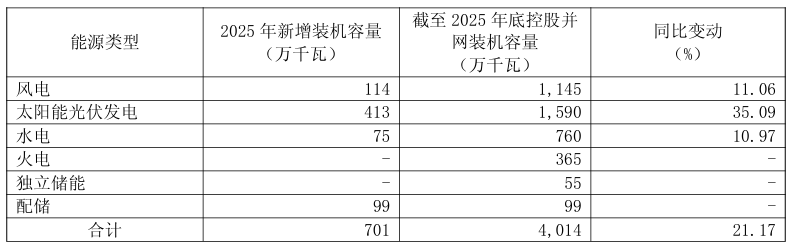截至2025年底,中国电建控股并网装机容量4014万千瓦,同比2024年701万千瓦增长21.17%。其中,风电装机1145万千瓦,同比增长11.11%;太阳能发电装机1590万千瓦,同比增长35.09%;水电装机760万千瓦,同比增长10.97%;新增配储装机99万千瓦;火电装机365万千瓦;独立储能装机55万千瓦。