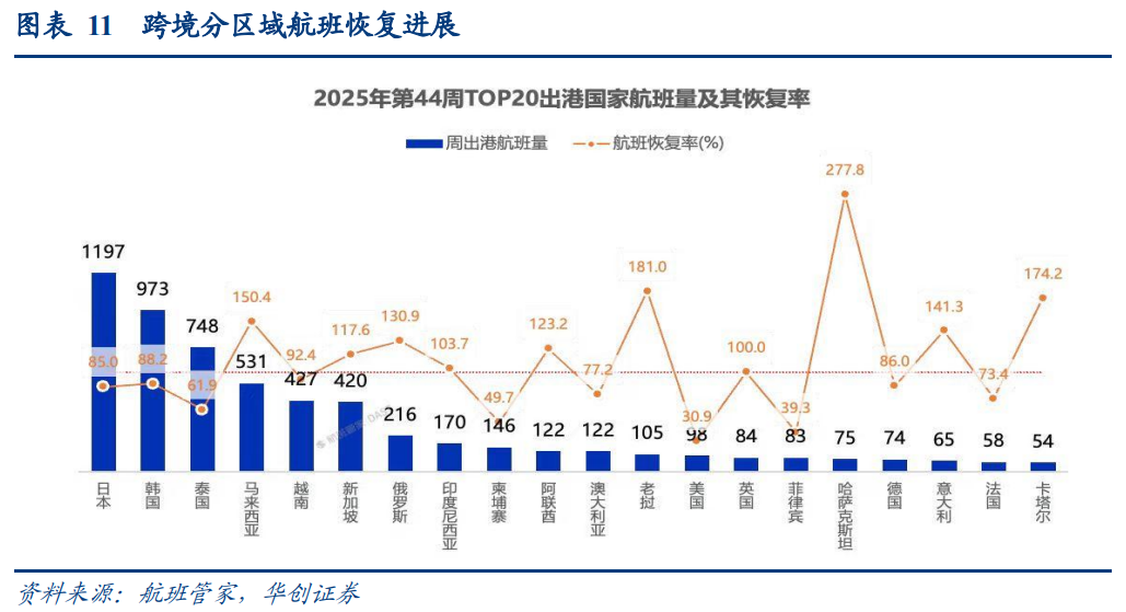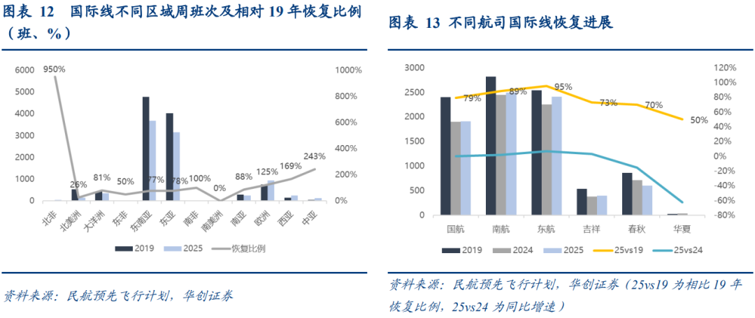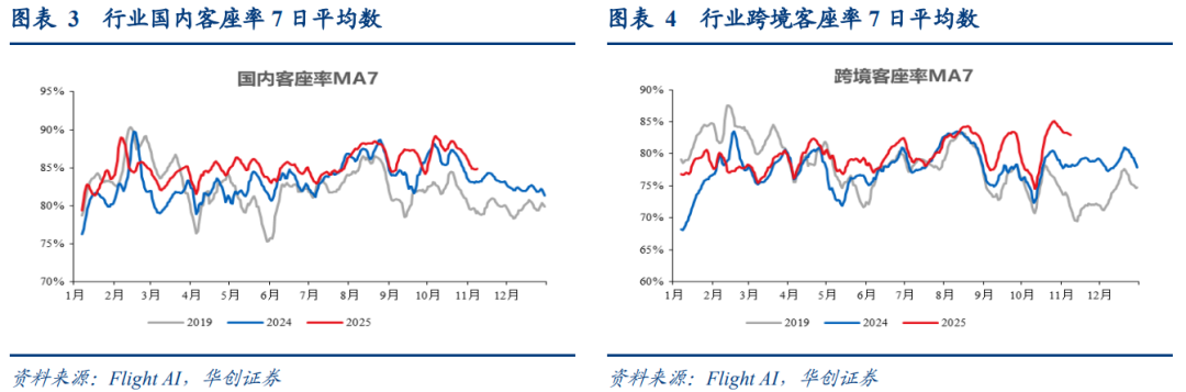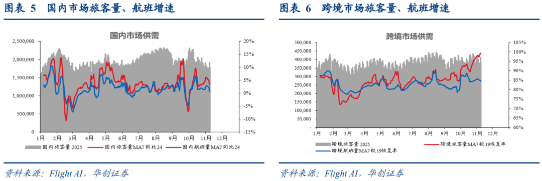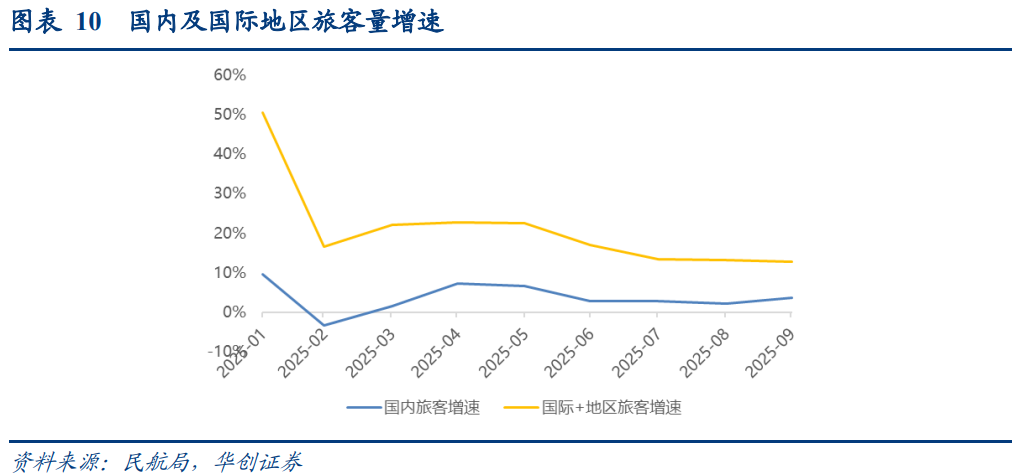 年初以来,跨境需求增速持续高于国内,据民航局数据,25年1-9月,国内旅客量同比 3.5%;国际 地区旅客同比 20.3%,且国际地区旅客已超出19年同期2.3%。
