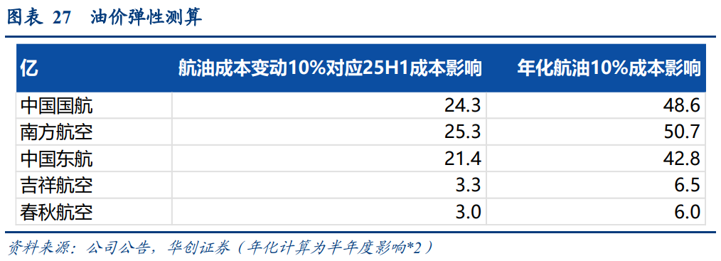 根据各家航司半年度披露,10%的油价变动对应年化成本端影响: