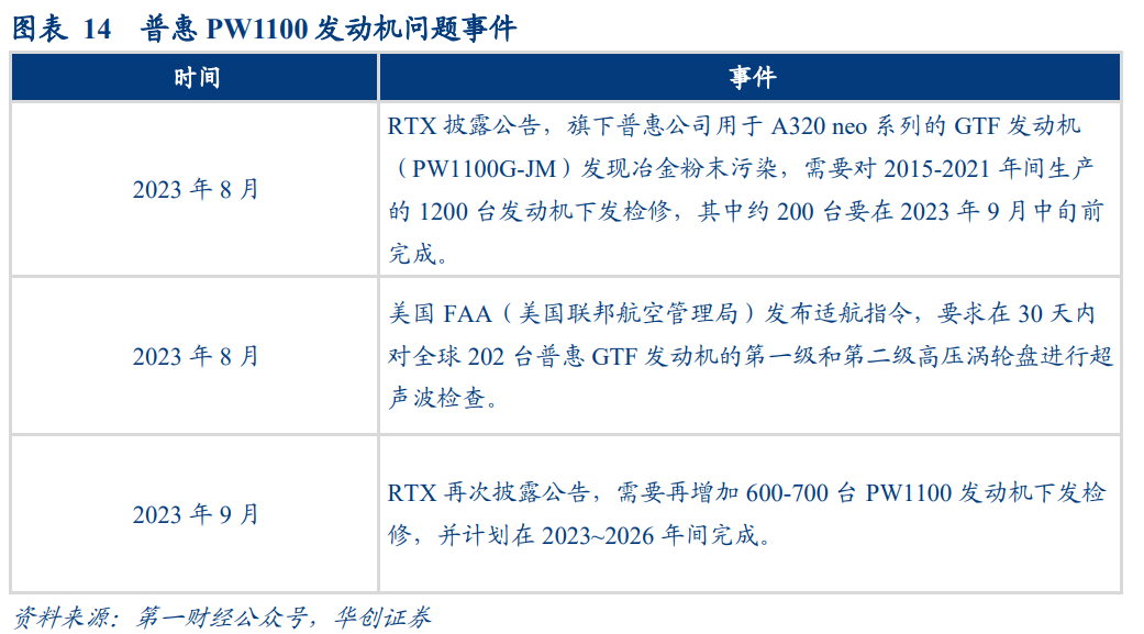 2023年8月,普惠公司的母公司RTX陆续发布公告,拟召回检修PW1100G发动机,其主要装配在空客A320 neo系列飞机,据称用于制造发动机的零件出现冶金粉末污染,可能会造成部件加速磨损。根据第一财经公众号资料,RTX公司需要对2015~2021年间生产的1200台发动机召回检修;2023年9月,RTX再次披露公告,新增600~700台发动机送检,合计“下发检修”发动机达到1800~1900台。