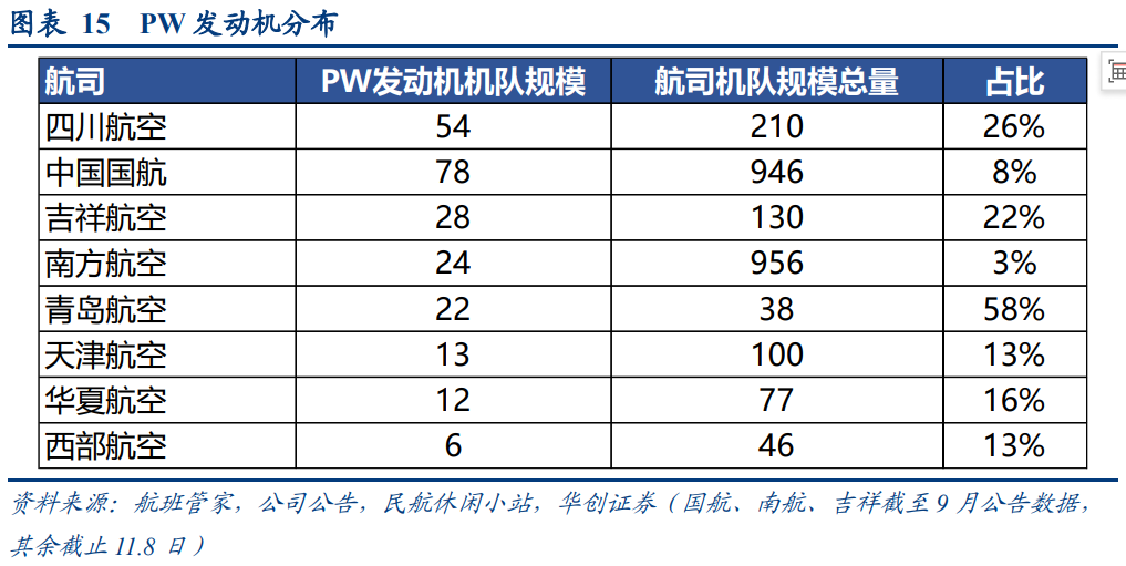 根据航班管家数据,在23年召回检修发生时,国内有9家航空公司运营237架搭载PW1100发动机的A320飞机。根据第一财经公众号信息,RTX公司公告,PW1100发动机的“下发检修”将在2023~2026年间完成,预计每台发动机从拆下送检到重新装回飞机的时间需要250~300天,将导致一定数量的飞机停飞。