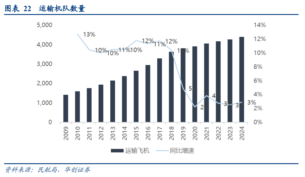 2020年后,行业引进继续降速。2020-2024年行业运输机队净增速分别为2.2%、3.9%、2.7%、2.5%和2.9%。