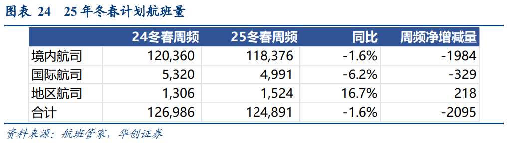 分航司类型来看:25年冬春季,境内航司周频净减少1984班,同比-1.6%;国际航司净减少329班,同比-6.2%,地区航司净增加218班,同比 16.7%,合计周航班量同比24冬春航季减少2095班次,同比-1.6%。