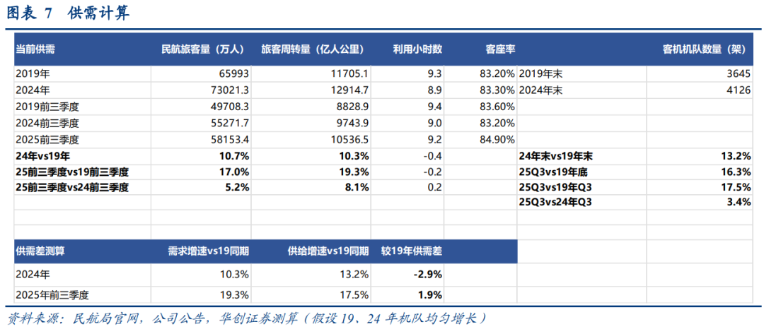 25Q1-3 vs 19Q1-3,旅客量周转量 19.3%,机队方面,测算25年9月底相较于2019年末的机队 16.3%,相较于2019年9月底预计增幅为17.5%,供需差已转正至1.9pct。