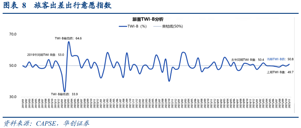 而到9月,旅客出差出行意愿指数重回扩张区间,TWI-B达到50.4%,高于50%荣枯线临界点,环比8月上升1.3pct;最新11月的数字为50.8%,保持在扩张区间。