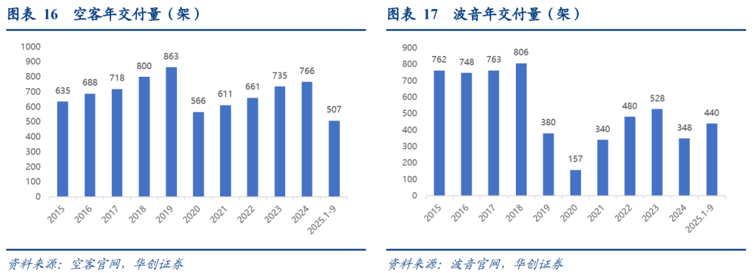 空客2024年全年交付766架,较2019年的863架次仍有近100架的差距;2025年前三季度交付507架。