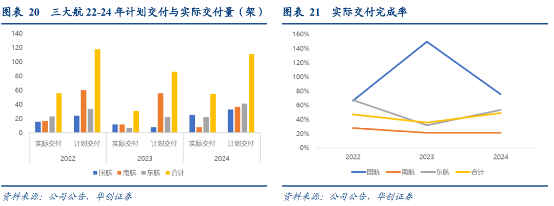 3)复盘22-24年,三大航实际交付不足年初预期数50%。我们复盘2022-2024年三大航计划交付量与实际交付情况对比,结果显示连续三年三大航合计交付完成率低于50%。