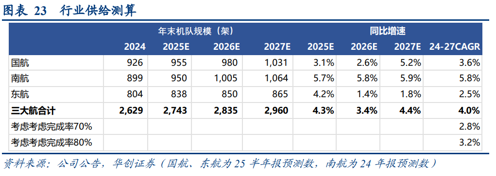 如前文计算,22-24年,三大航实际交付不足年初预期数50%。考虑产能仍在爬坡,假设25-27年完成率提升至70%~80%,则对应CAGR预计在3%附近。
