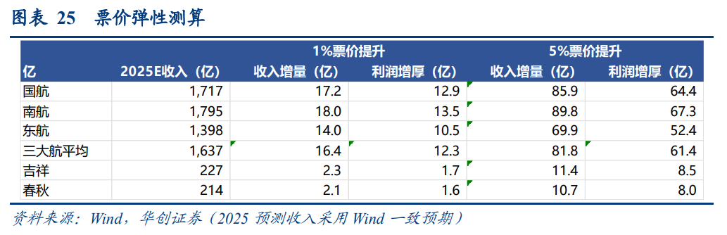 以三大航均值看,采用Wind一致预期收入,2025年平均收入预计为1637亿:若票价提升1%,对应平均收入增加16.4亿,利润增厚12.3亿;若票价提升5%,对应平均收入增加81.8亿,利润增厚61.4亿。且三大航尚有未抵扣亏损,实际税率或低于标准值。