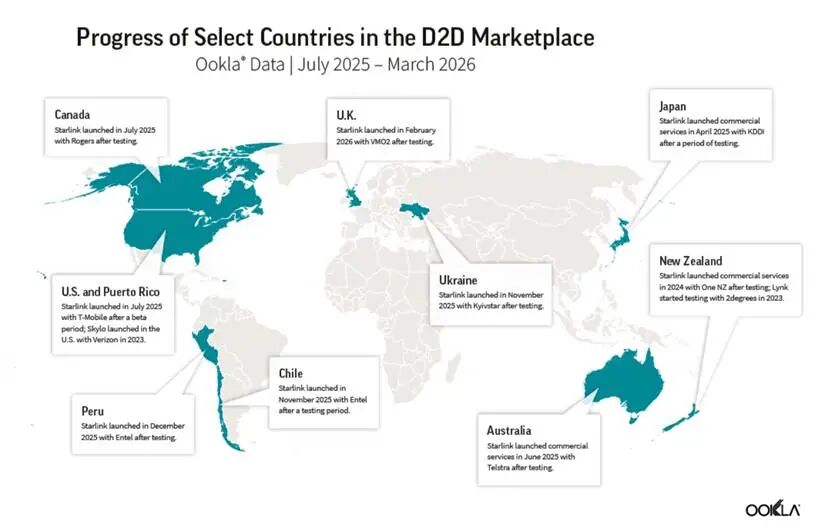 Ookla作为测试厂商,拥有广泛采用的测试工具。该厂商通过Android智能手机的数据,基于Starlink、Skylo和Lynk的卫星注册数据,绘制了D2D市场的进展地图,例如2025年7月至2026年3月间D2D连接情况如下: