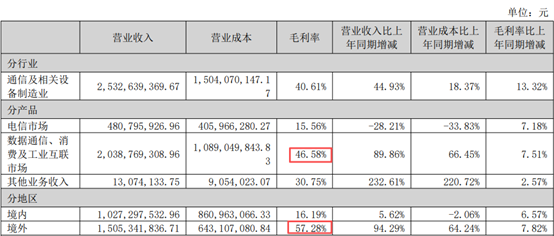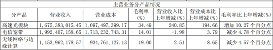 翻开两公司在2025年交出的华丽答卷,最为戏剧性的“体量与利润倒挂”体现出它们在产业链生态位上的区别。长芯博创身居上游核心枢纽,主营精密光电互连组件。其营收中数据通信及工业互联网产品占比高达80.50%,电信产品占18.98%,这种结构让它直接承接了AI算力底座的爆发式的需求。特别是前者的毛利率在2025年直接飙升至46.58%,成为拉高整体盈利的利器。高速有源光缆(AOC)、直连铜缆(DAC)等核心光电互联零组件,让公司在25.3亿的有限营收中取得了3.4亿的净利润。