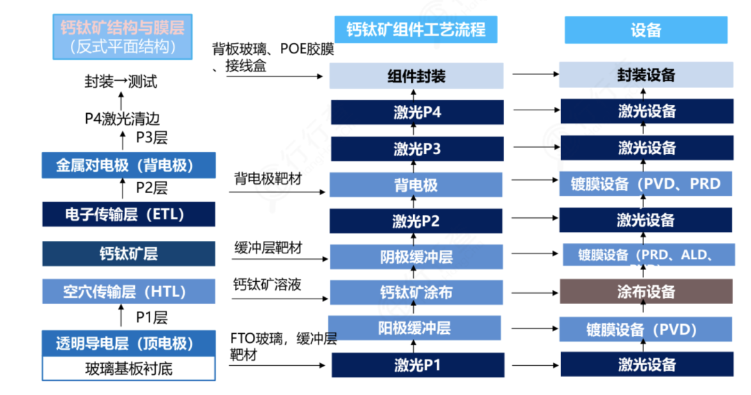 设备环节:整个工艺流程需要多种专业设备的支持。例如,涂布设备用于钙钛矿溶液的均匀涂布,镀膜设备(如PVD、PRD、ALD)用于沉积各种薄膜层,激光设备则在多个环节中进行精确切割和处理,而封装设备负责最终的组件封装。
